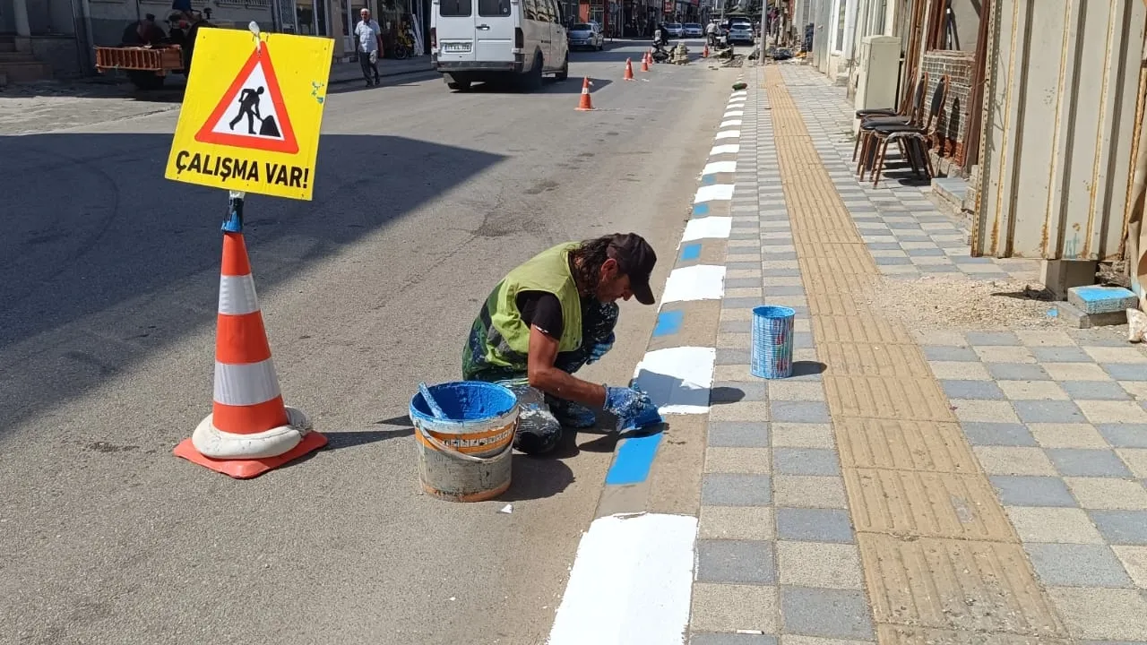 Bilecik’in Pazaryeri ilçesinde belediye ekipleri, ilçe merkezindeki ana caddelerde kaldırım taşlarını boyayarak şehre görsel bir canlılık kazandırıyor.Pazaryeri Gündem / BİLECİK (İGFA) - Bilecik Pazaryeri’nin simgesi haline gelen Pazaryerispor’un renkleri mavi ve beyaz, kaldırım taşlarına yansıtılarak hem estetik bir görünüm oluşturuyor hem de vatandaşların takdirini topluyor.