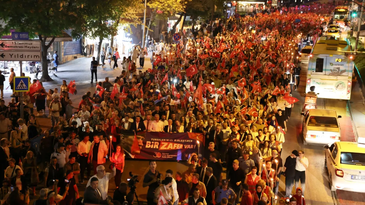 Bursa Büyükşehir Belediyesi, 30 Ağustos Zafer Bayramı’nın 103. yılını Tarihi Bina’dan Millet Bahçesi’ne fener alayı yürüyüşü ve Göksel konseriyle coşkuyla kutladı. Başkan Mustafa Bozbey, “30 Ağustos, özgürlük ve bağımsızlıktır. Bu zafer, vatanımızı armağan etti” dedi.Adiviye ELBAŞ - gazeteabc / BURSA (İGFA) - Bursa, 30 Ağustos Zafer Bayramı’nın 103. yılını, Bursa Büyükşehir Belediyesi’nin düzenlediği fener alayı yürüyüşüyle kutladı.