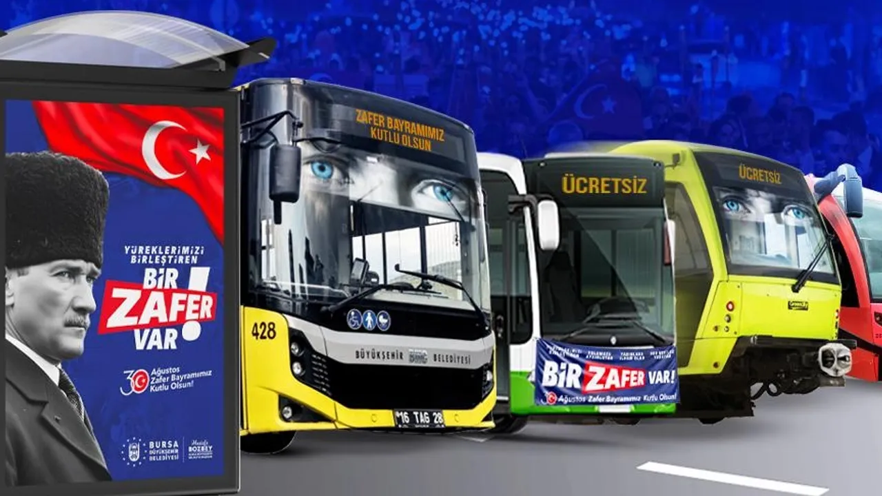 Bursa Büyükşehir Belediyesi, vatandaşların tören ve kutlamalara kolaylıkla ulaşabilmesi amacıyla 30 Ağustos Zafer Bayramı’nda kent içi toplu ulaşımın ücretsiz olacağını açıkladı.BURSA (İGFA) - Bursa Büyükşehir Belediyesi tarafından 30 Ağustos Zafer Bayramı kutlama ve etkinliklerinin coşkulu kalabalıklarla yapılabilmesi için BursaRay, Burulaş otobüsleri ve tüm Özel Halk otobüslerinde 30 Ağustos Cumartesi günü saat 23.59’a kadar ulaşımın ücretsiz olacağı belirtildi.