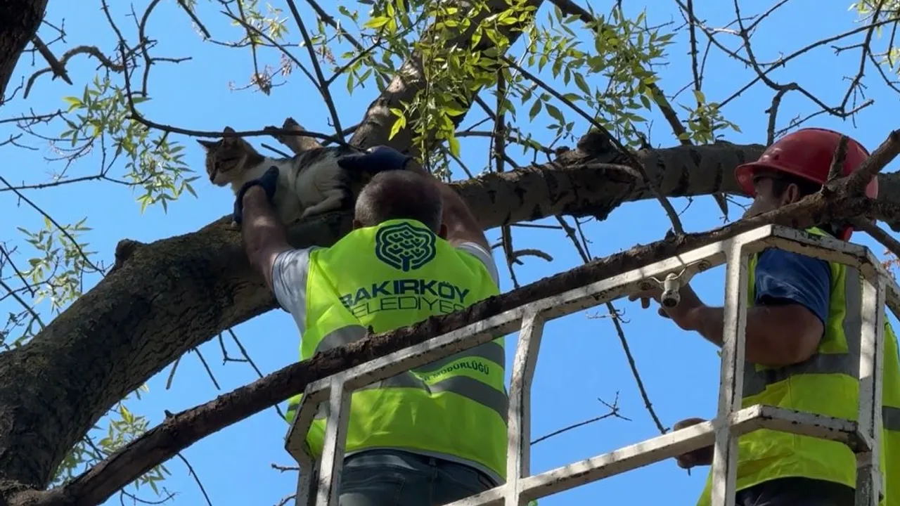 İstanbul'da tırmandığı ağaçta 3 gündür mahsur kalan “Yumuk” isimli kedi, Bakırköy Belediyesi ekiplerinin müdahalesiyle kurtarıldı. Kurtarılan kedi, Veteriner İşleri Müdürlüğü ekiplerinin gerçekleştirdiği sağlık kontrolleri sonrasında yaşam alanına bırakıldı.İSTANBUL (İGFA) - Bakırköy Belediyesi ekipleri, vatandaşların ihbarı üzerine 3 gündür ağaçta mahsur kalan kediyi kurtardı.