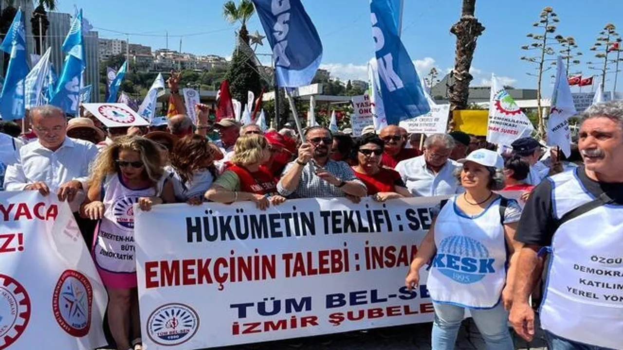 İzmir’in Konak ilçesinde, KESK ve bağlı sendikaların öncülüğünde 18 Ağustos 2025 Pazartesi günü düzenlenen bir günlük iş bırakma eylemi ve basın açıklaması, DİSK Devrimci Emekliler Sendikası (Dev Emekli-Sen) tarafından desteklendi. Eylemde, kamu emekçileri ve emekliler 2026 için önerilen düşük zam oranlarını protesto etti.Erkan ÇAKILLI / İZMİR (İGFA) - Kamu emekçileri, üretimden gelen güçlerini kullanarak iş bıraktı ve alanlarda bir araya geldi.