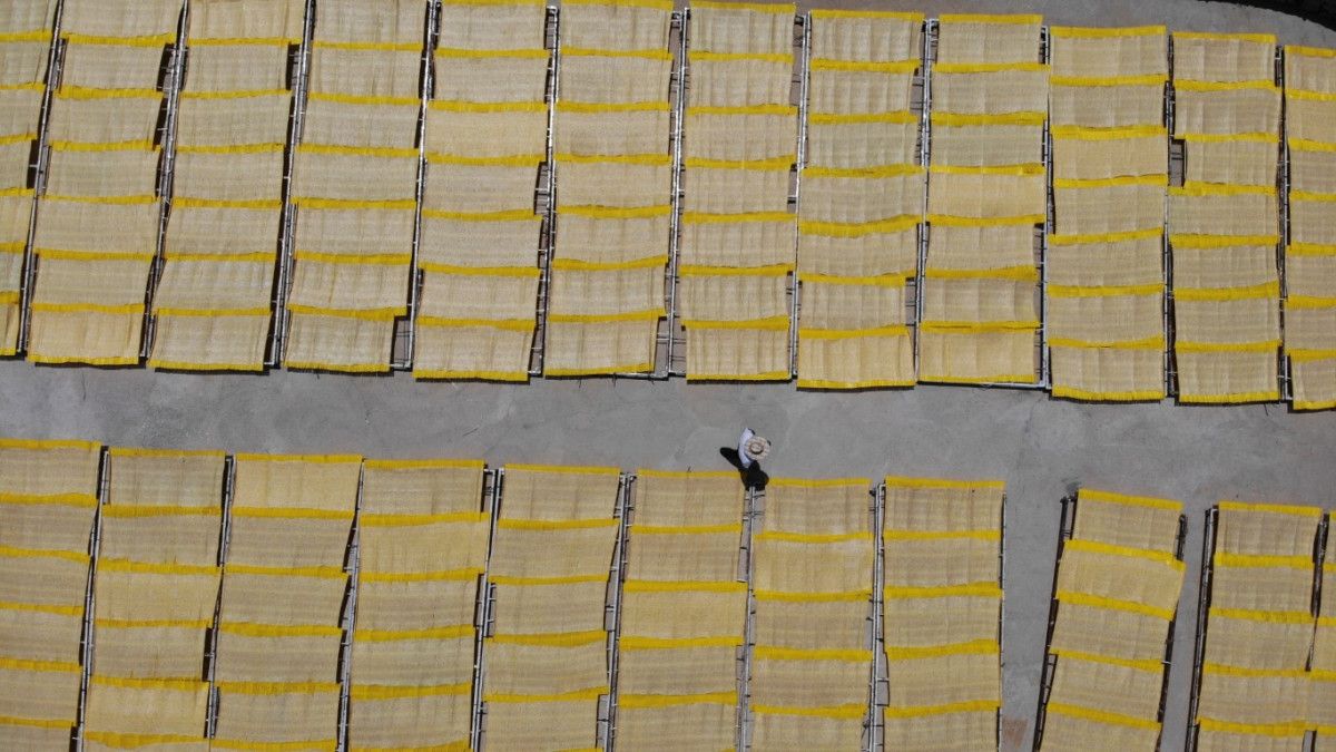 Geleneksel serme usulünün yerini alan makineli sistemle tarhana geniş kurutma alanlarına seriliyor ve güneşte kurutuluyor.